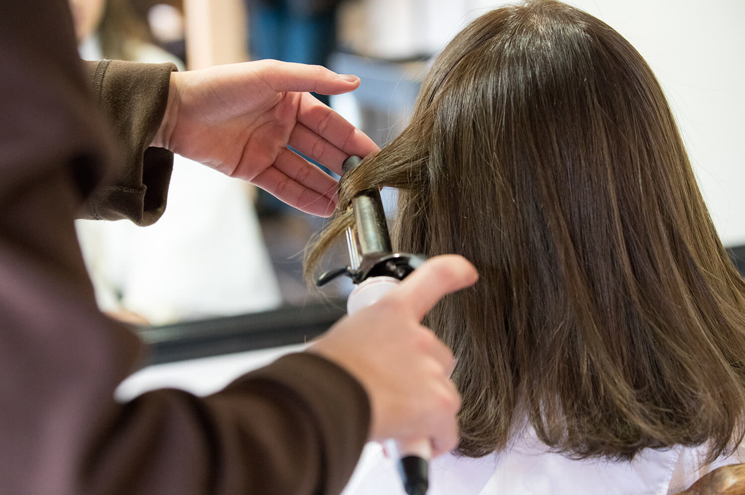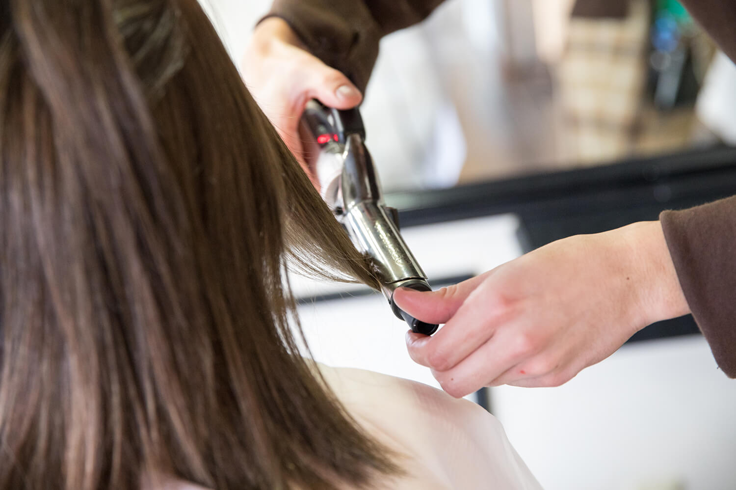滑らせるようにコテを使いながら毛先だけにワンカールで巻いていく。