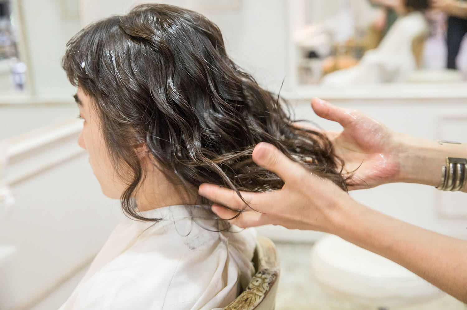 ムースとオイルを使い、ツヤ感を意識したスタイリングに整える。