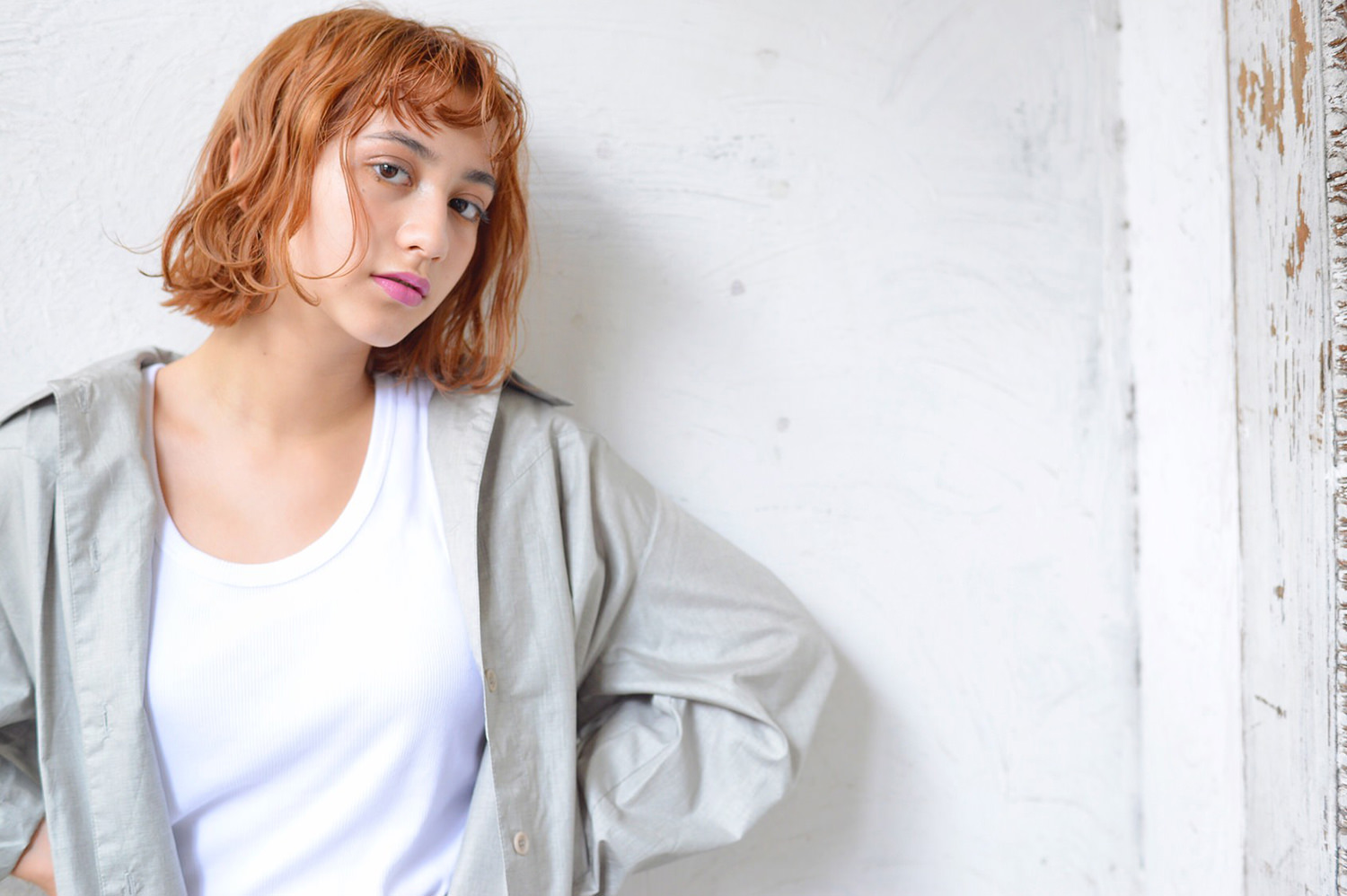 カットは顎下切りっぱなしのボブベース、カラーはアプリコットオレンジ。