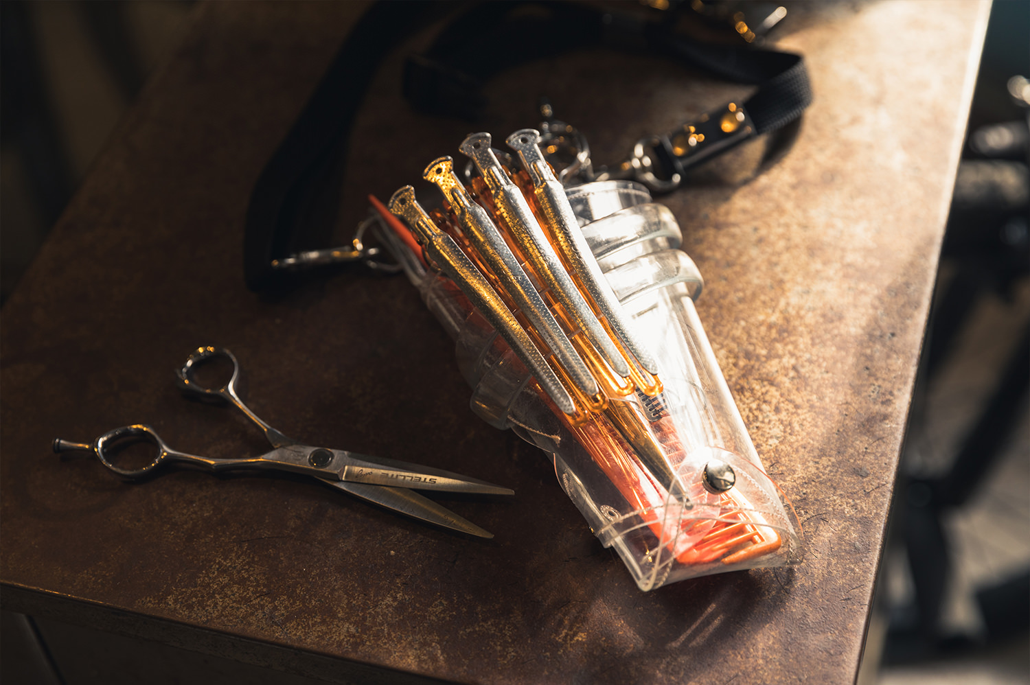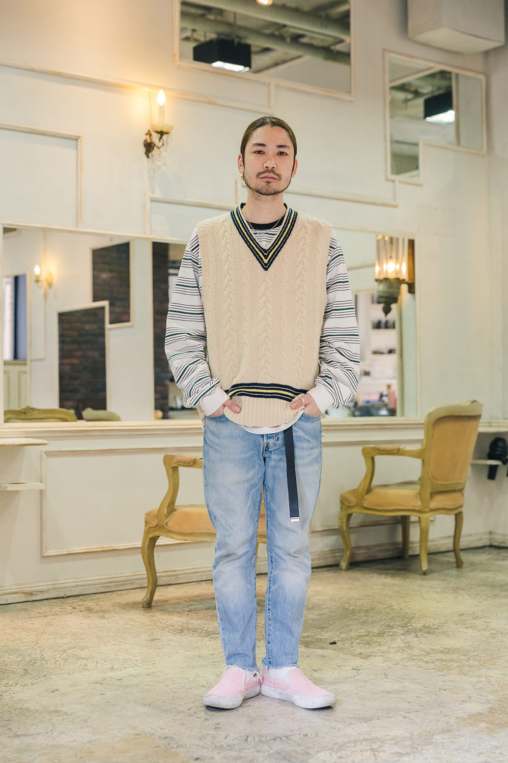Vest : Rugby by Ralph Lauren / Tops : TBPR / Pants : リーバイス / Shoes : VANS / Scissors case : HYNE TOKYO