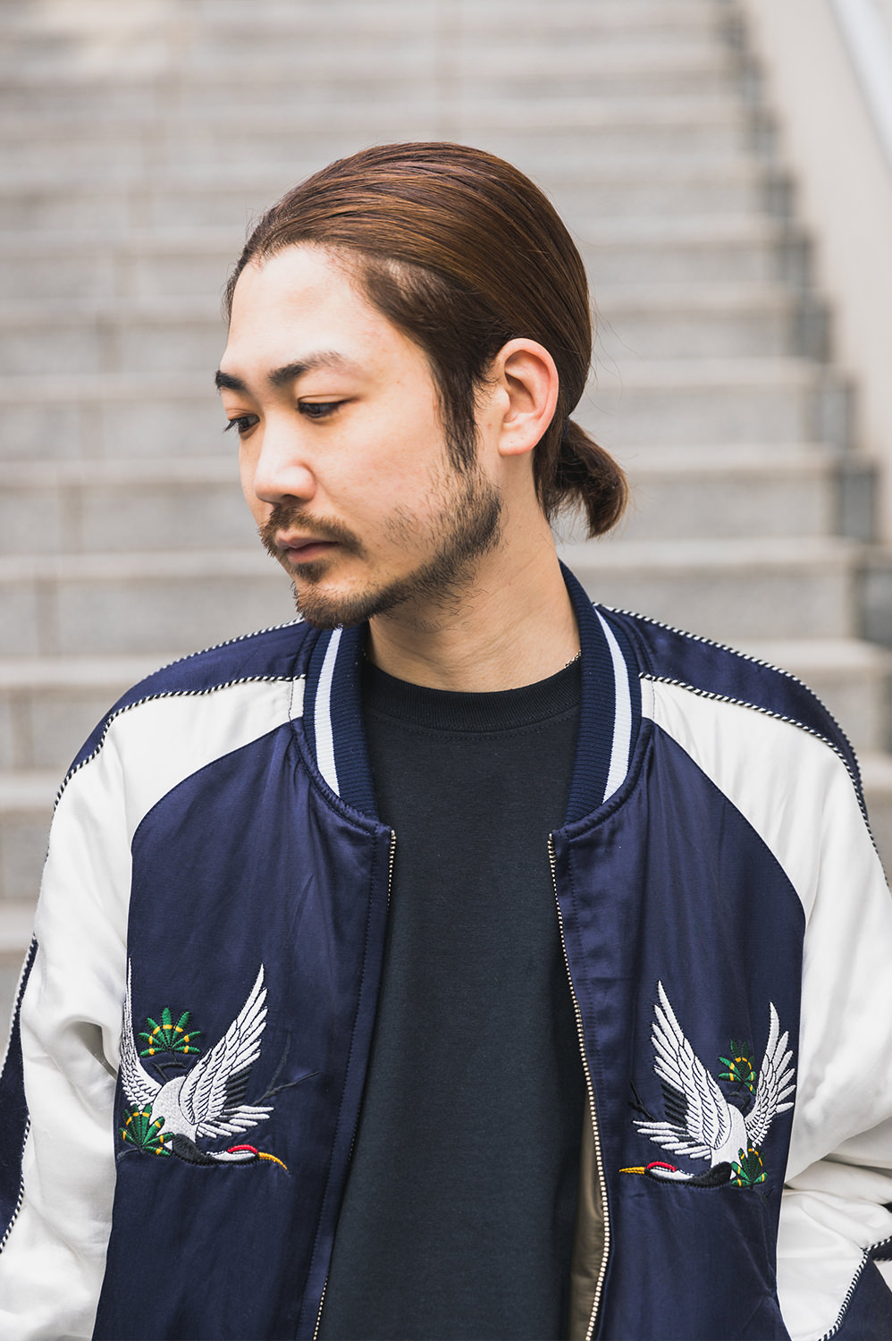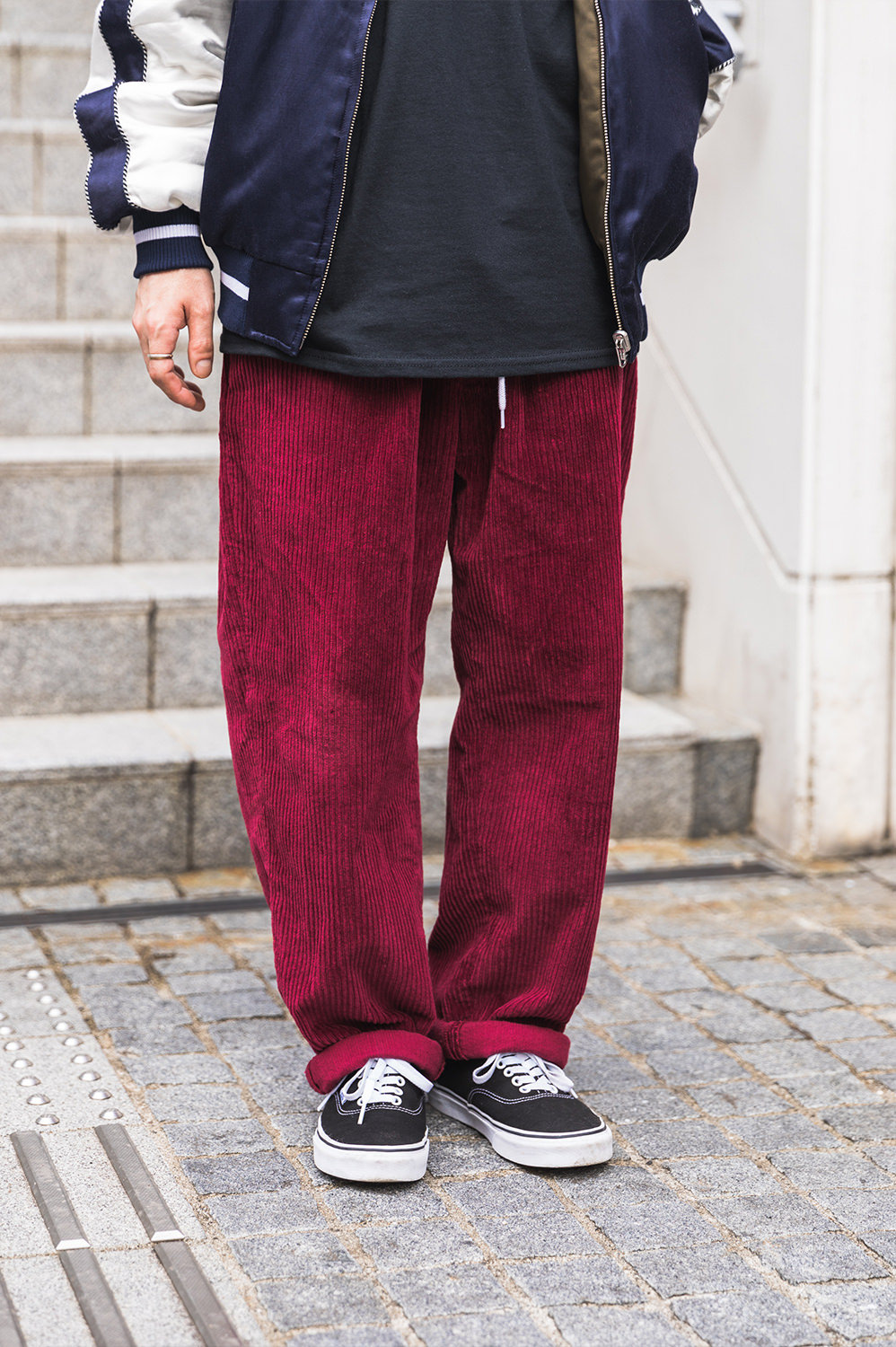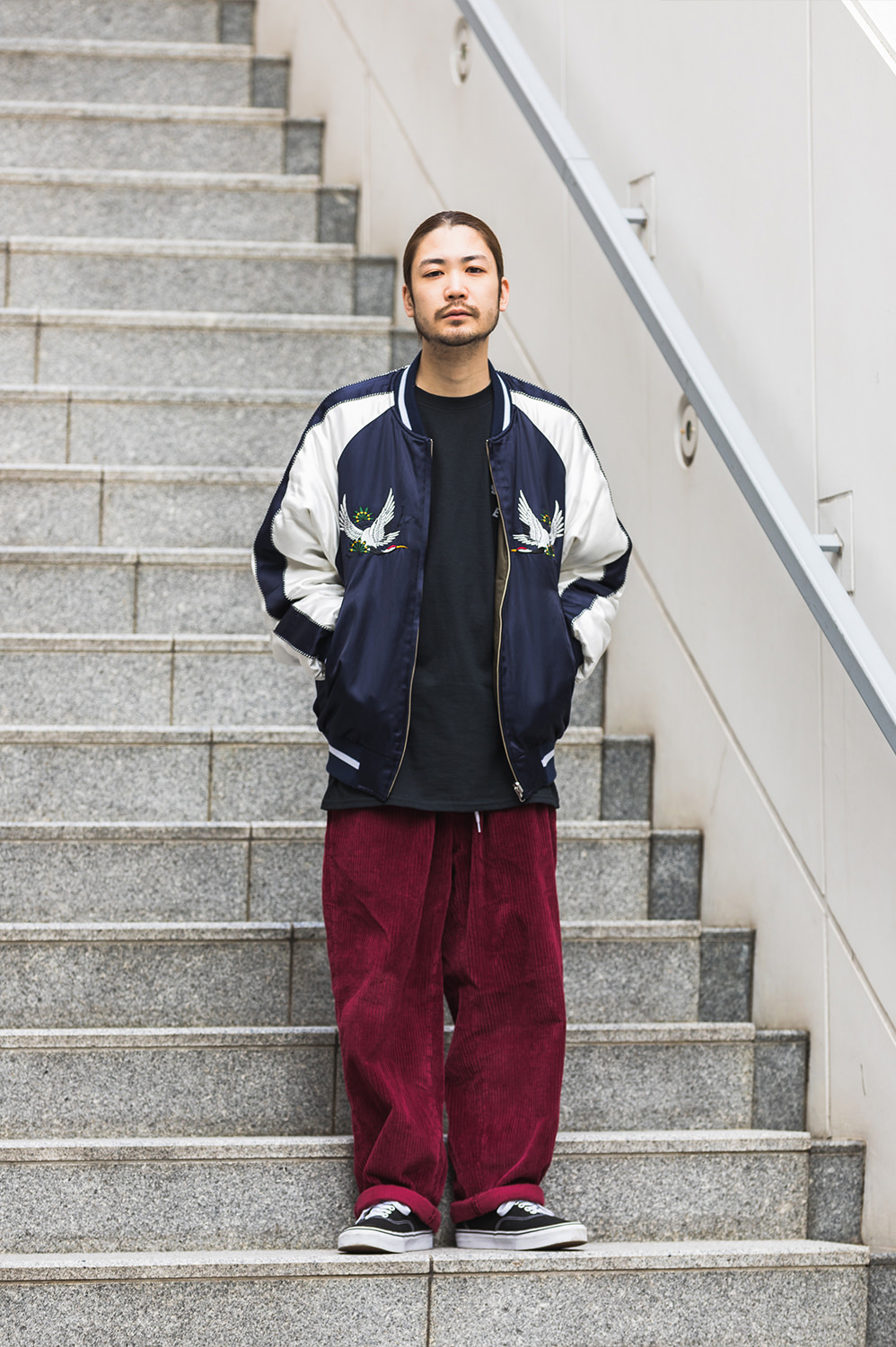 Goro:休みの日は、とことんカジュアルに。動きやすい服が好きなので、上下ともに緩めのシルエットをセレクト。今年らしい太めのコーデュロイパンツは色味も気に入っていて、スカジャンの辛さをほどよくカジュアルダウンしてくれる、お気に入りのアイテムです。
