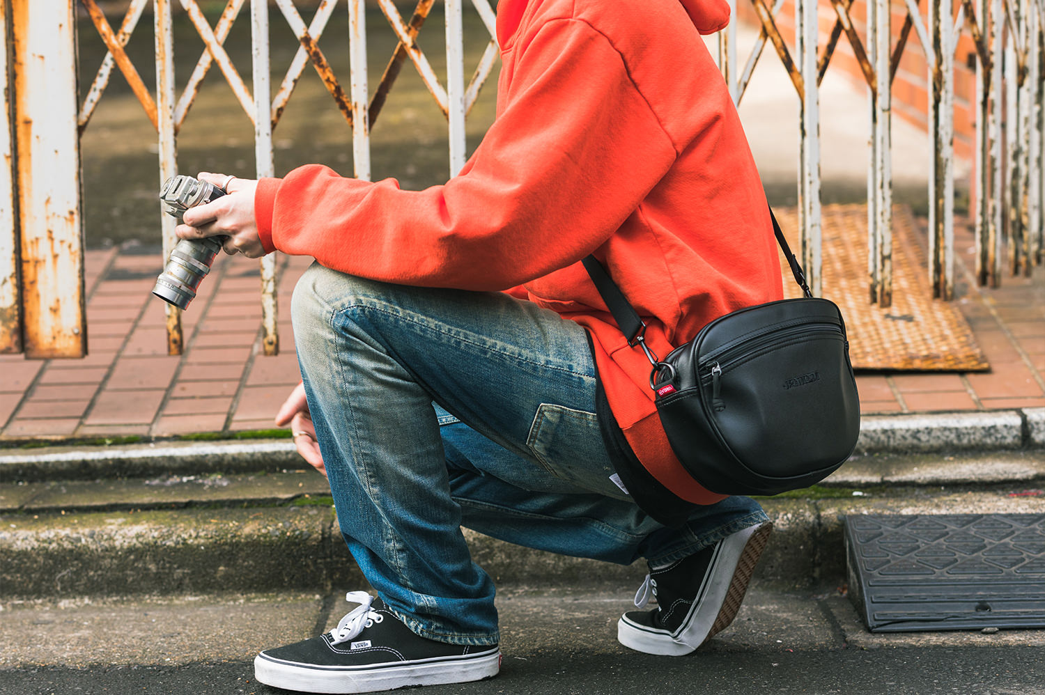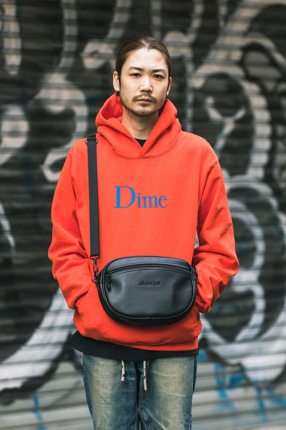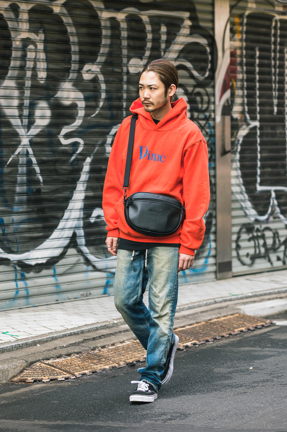 Goro : 鮮やかなオレンジが気に入った Dime のパーカー。大きめの衿ぐりやフード、光沢感のある生地など、デニム合わせでもこなれて見せてくれるところがお気に入りです。 かっちりとしたショルダーバッグを合わせて、コーデのバランスを調整。