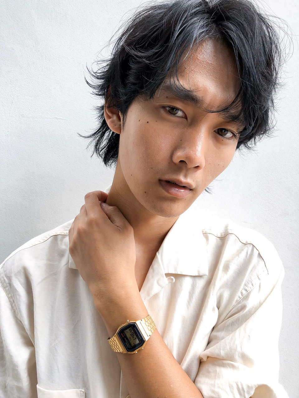 スタイリングは前髪をオールバックにかきあげながらラフに乾かし、バームやムースを揉み込むだけで完成!ナチュラルなほつれ感で、ふんわり優しいイメージに仕上げました。