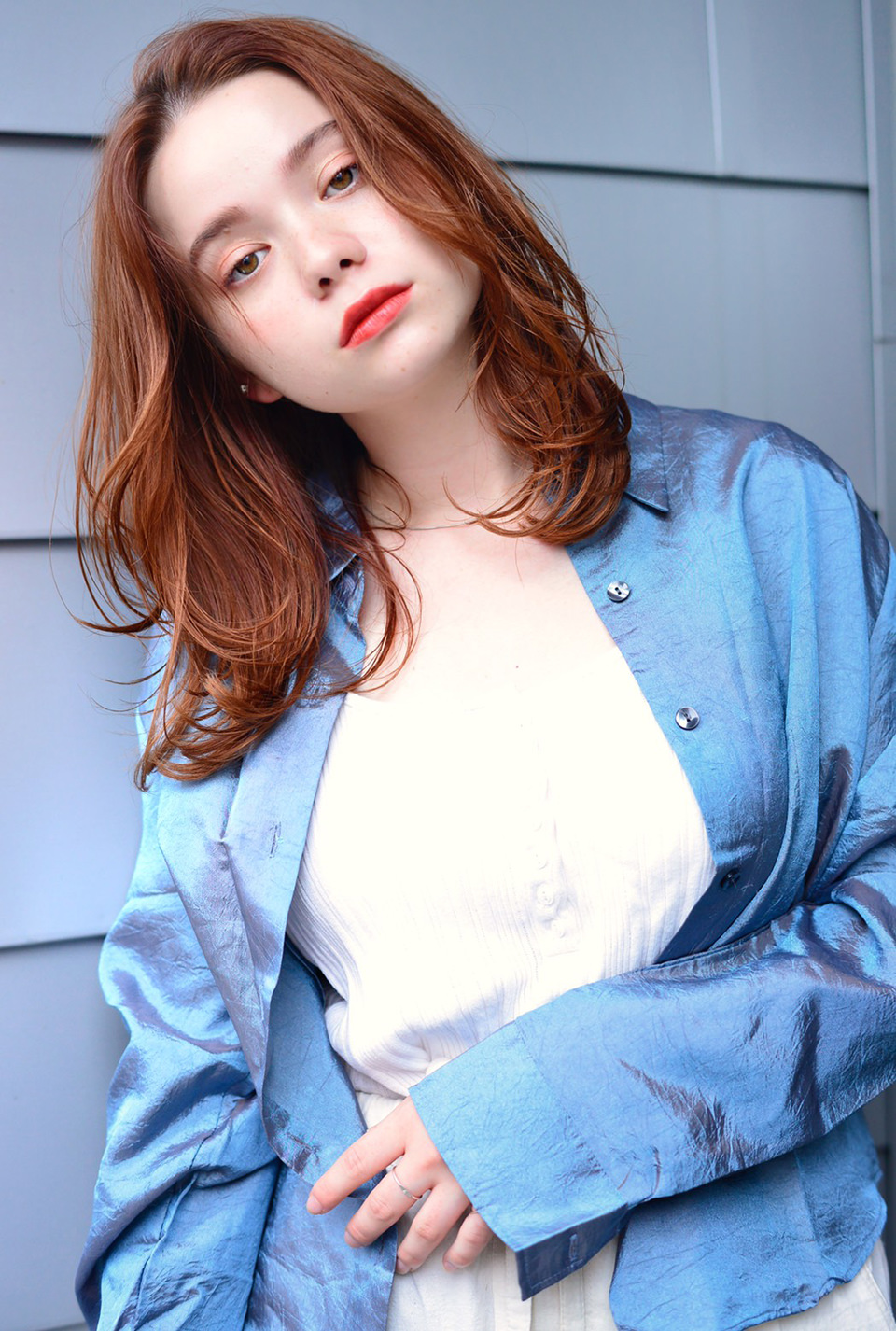 顔まわりに動きが出るようにカットした、レイヤースタイル。カラーは艶が出て肌に馴染む、アプリコットブラウンで染めています。