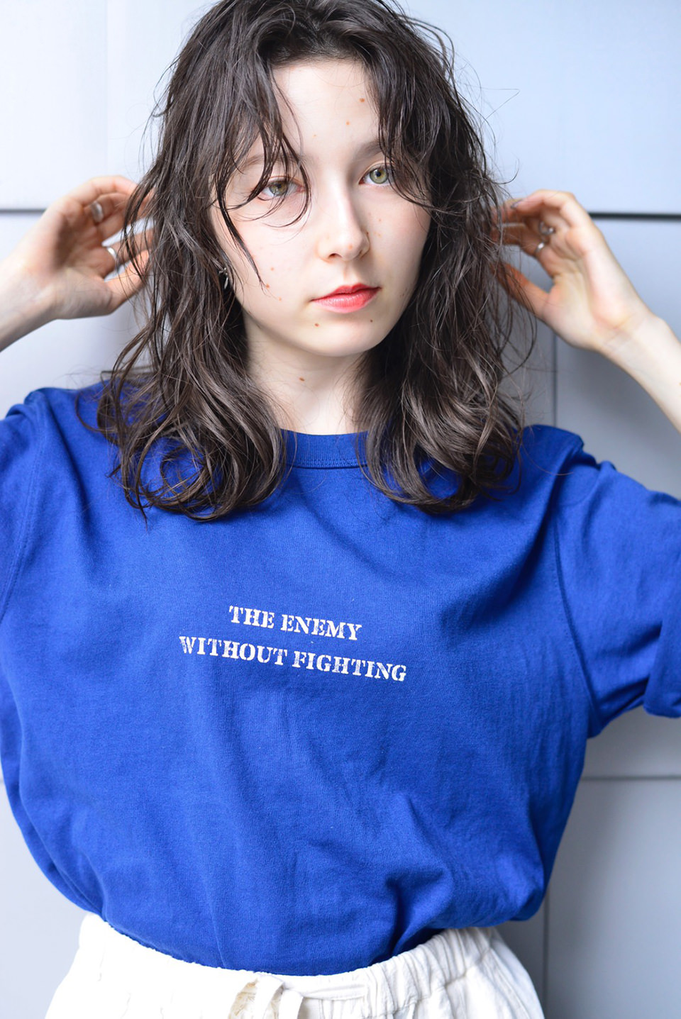 外国人のラフなくせ毛のようなパーマで、まとまりすぎない自然体なスタイルに。カラーは赤みの少ない透明感のあるブルージュを重ね、暗髪でもかろやかな印象に。