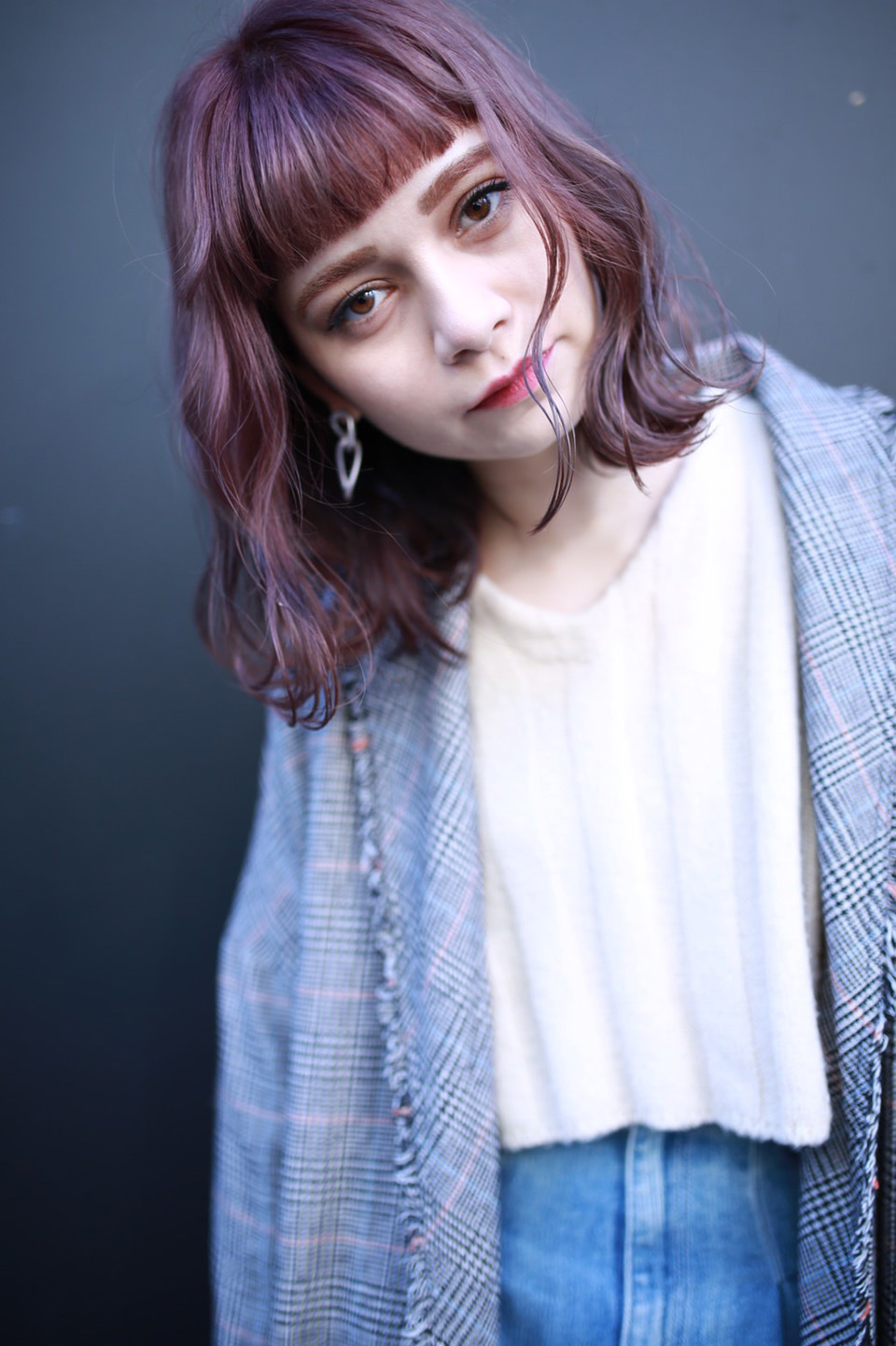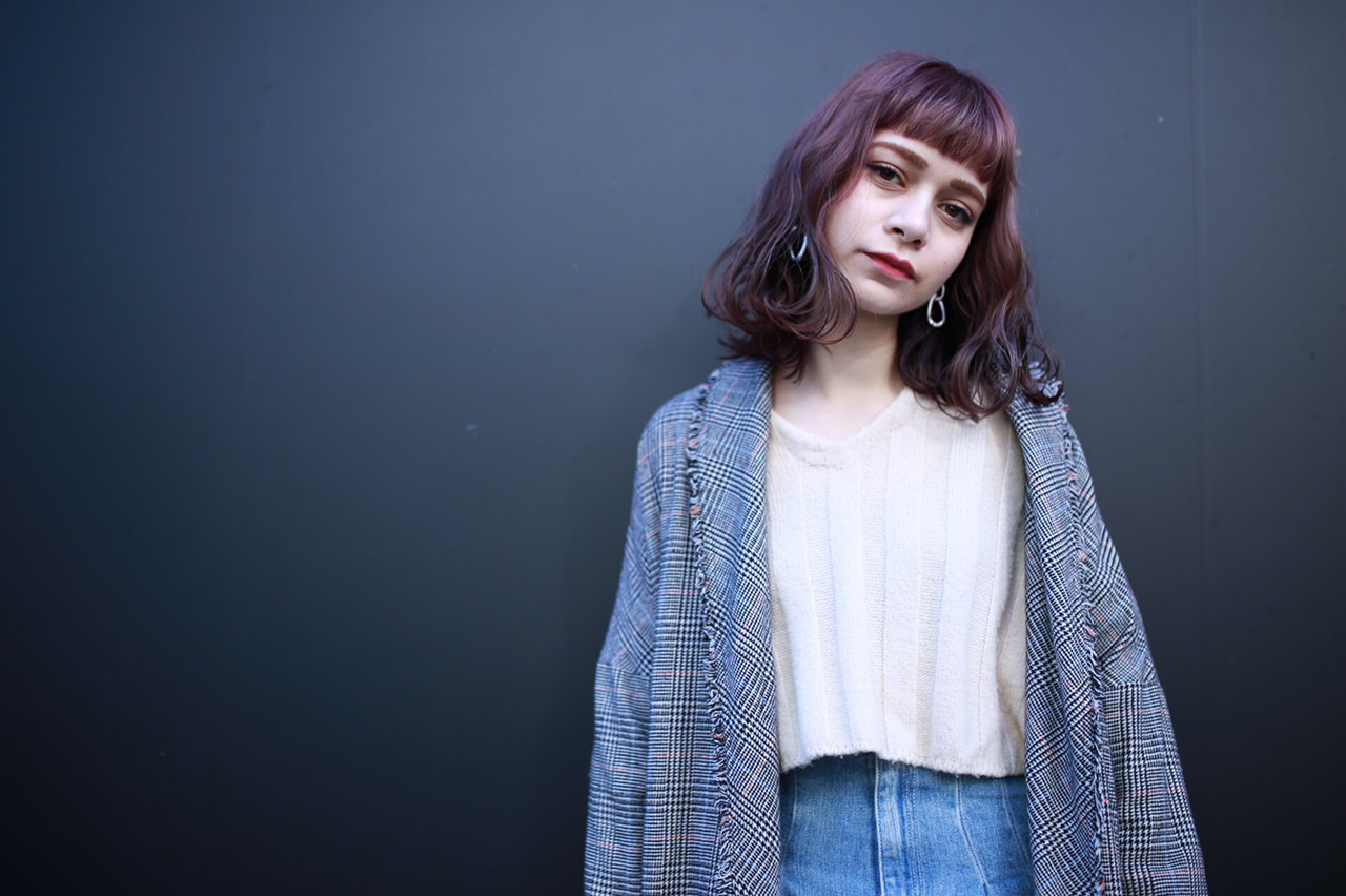 前髪は眉上に設定し、目鼻立ちがくっきりと見せることで小顔効果が期待できます。全体を太めのコテでゆるふわに巻き、大人ガーリーな雰囲気に。カラーはラベンダーピンクで艶感と柔らかさをプラス。