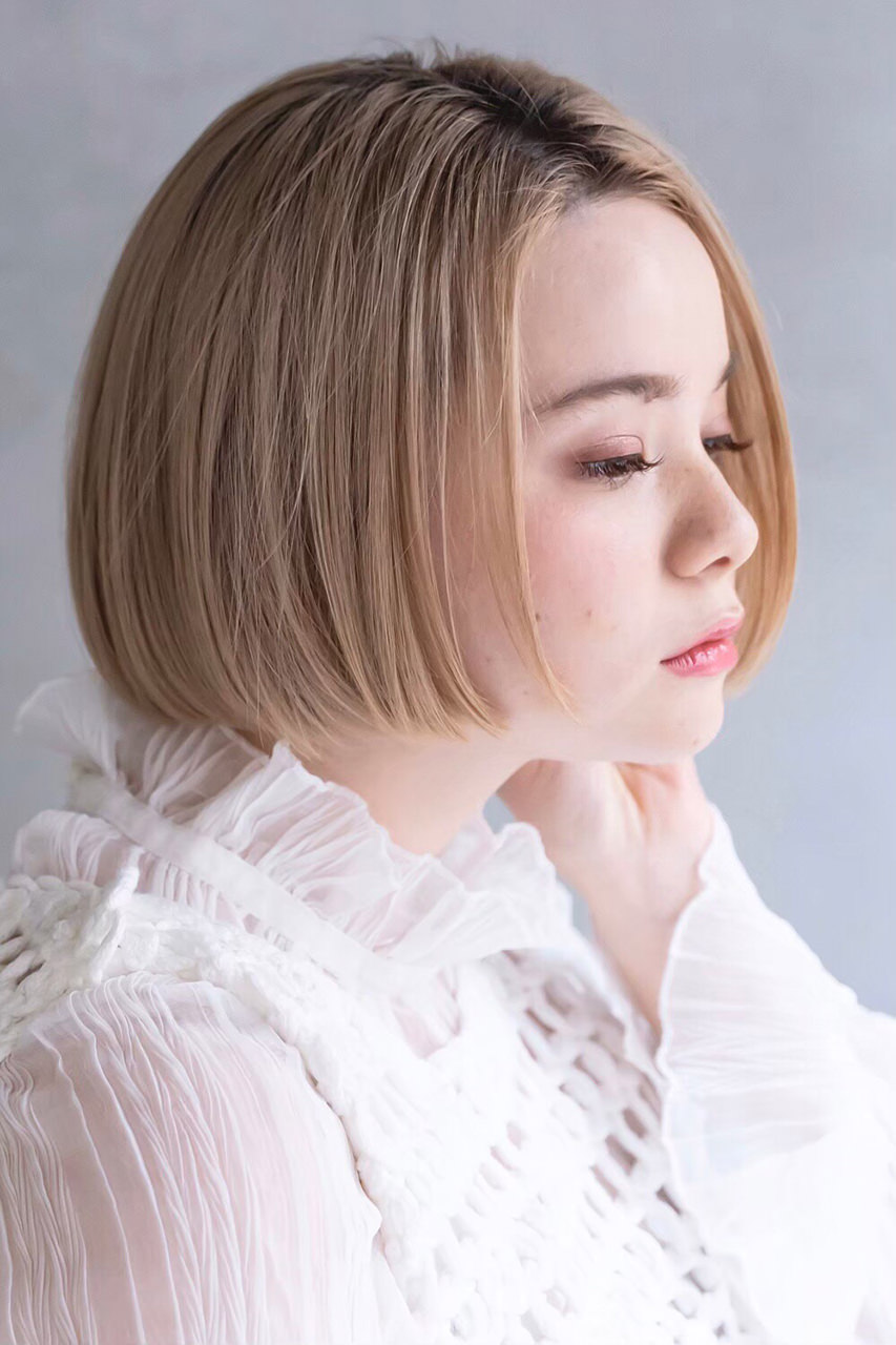 やわらかいハイトーンベージュに人気のミニボブを合わせ、「外国人の女の子」をイメージしたスタイル。スタイリングは全体に内巻きカールをつけ、N.ポリッシュオイルを束感が出るようになじませてセットします。