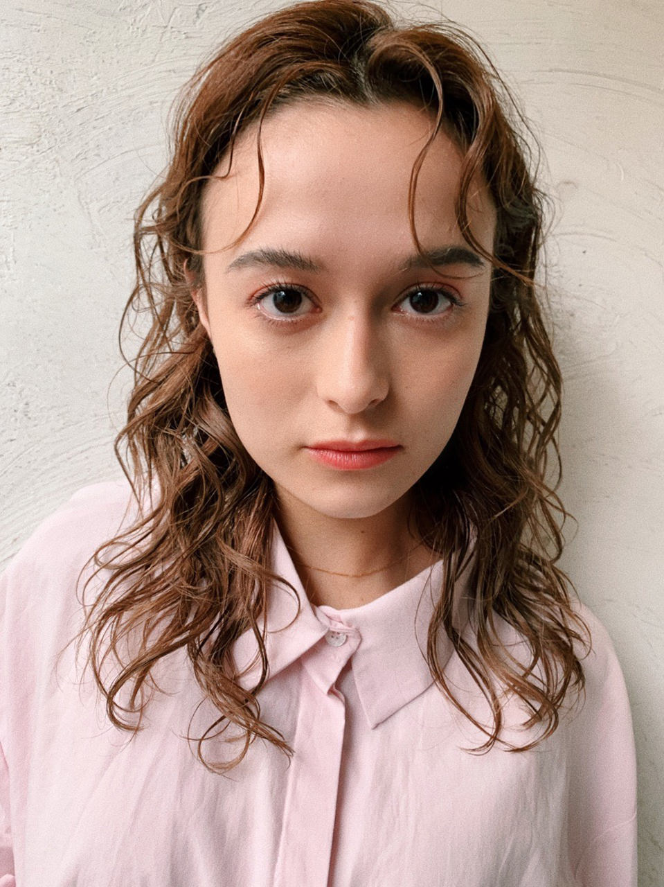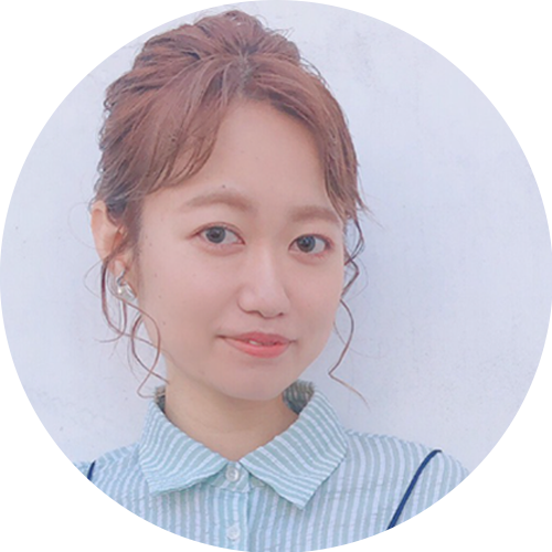 少しだけレイヤーを効かせた、ミディアムスタイル。スタイリングは、毛先は外ハネになるように全体に波ウェーブでベースを作り、前髪と表面に細かい動きを加えて、抜け感をプラスしました。