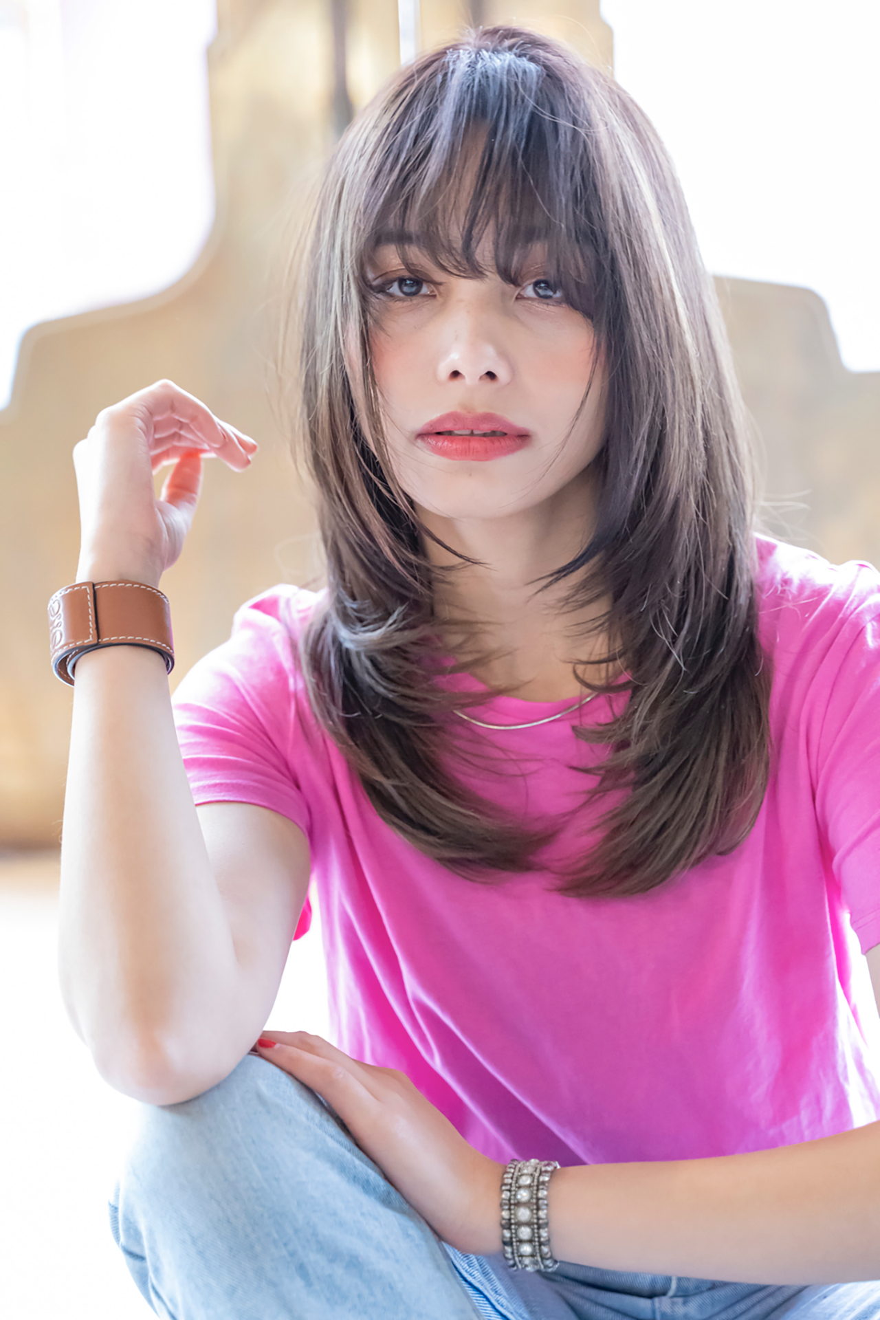 顔まわりにしっかりとレイヤーを入れた、ロングStyle。厚みのあるバングとレイヤーの軽さのバランスがポイントです。