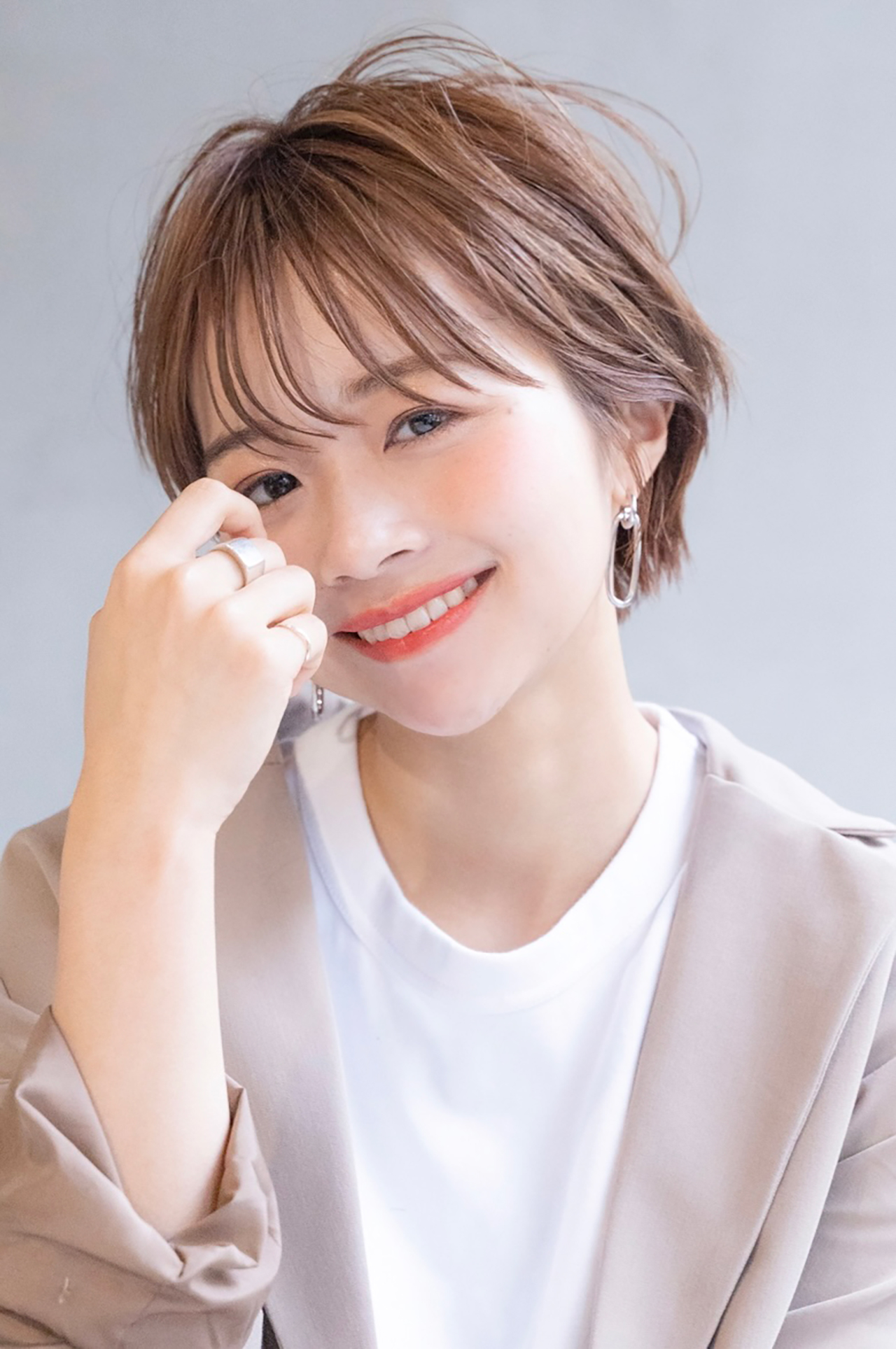 顔周りの髪の毛は耳かけして、大人クールな印象のショートヘア。前髪はキュートなベビーバングにして、可愛らしさとカッコよさをミックスしたStyleです。前髪の束感がしっかり出るように、ヘアオイルをつけてセットしました。