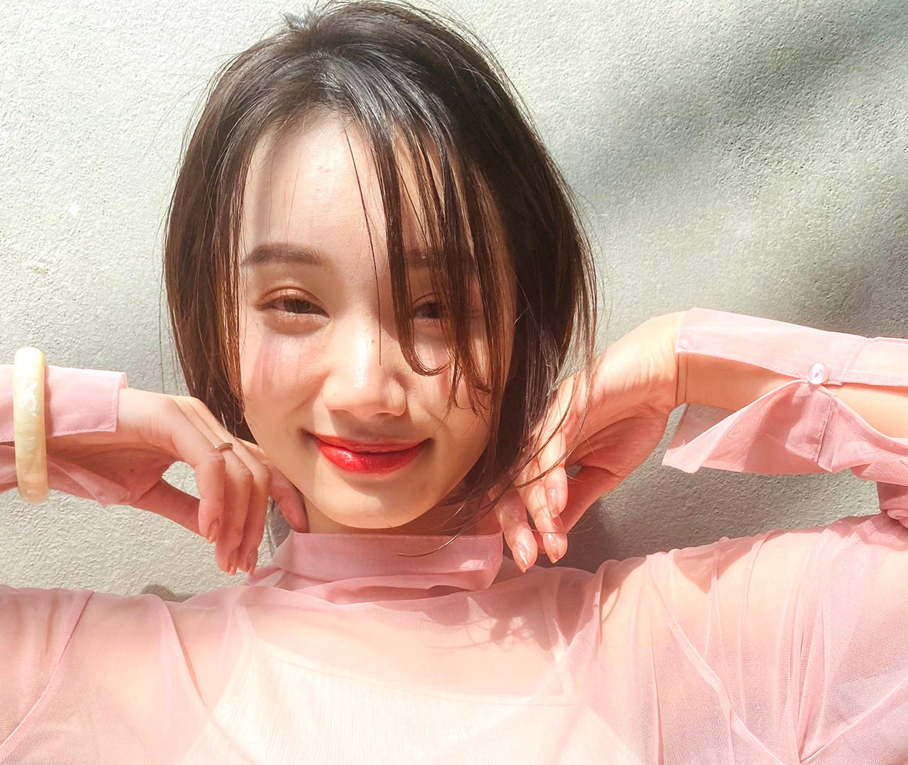 ▼ 26ミリのアイロンで、毛先を外ハネに巻く。前髪と毛先を中心にオイルのスタイリング剤をつけ、程よい束感をプラス。自然でありながら、こなれた印象に。