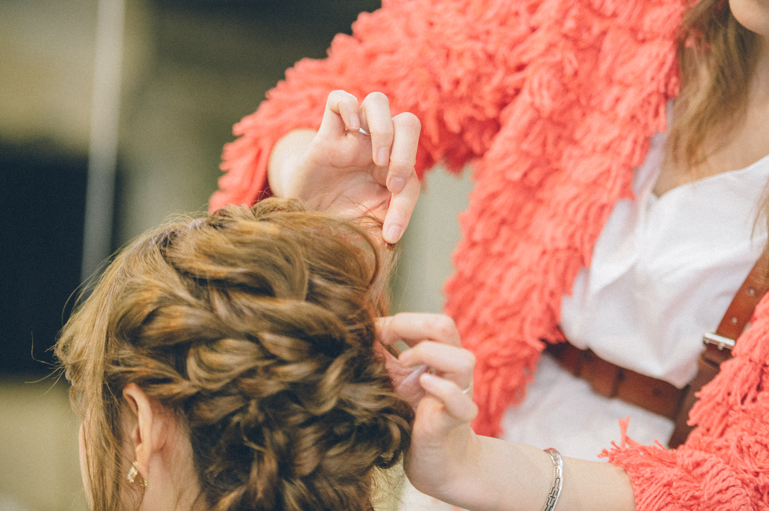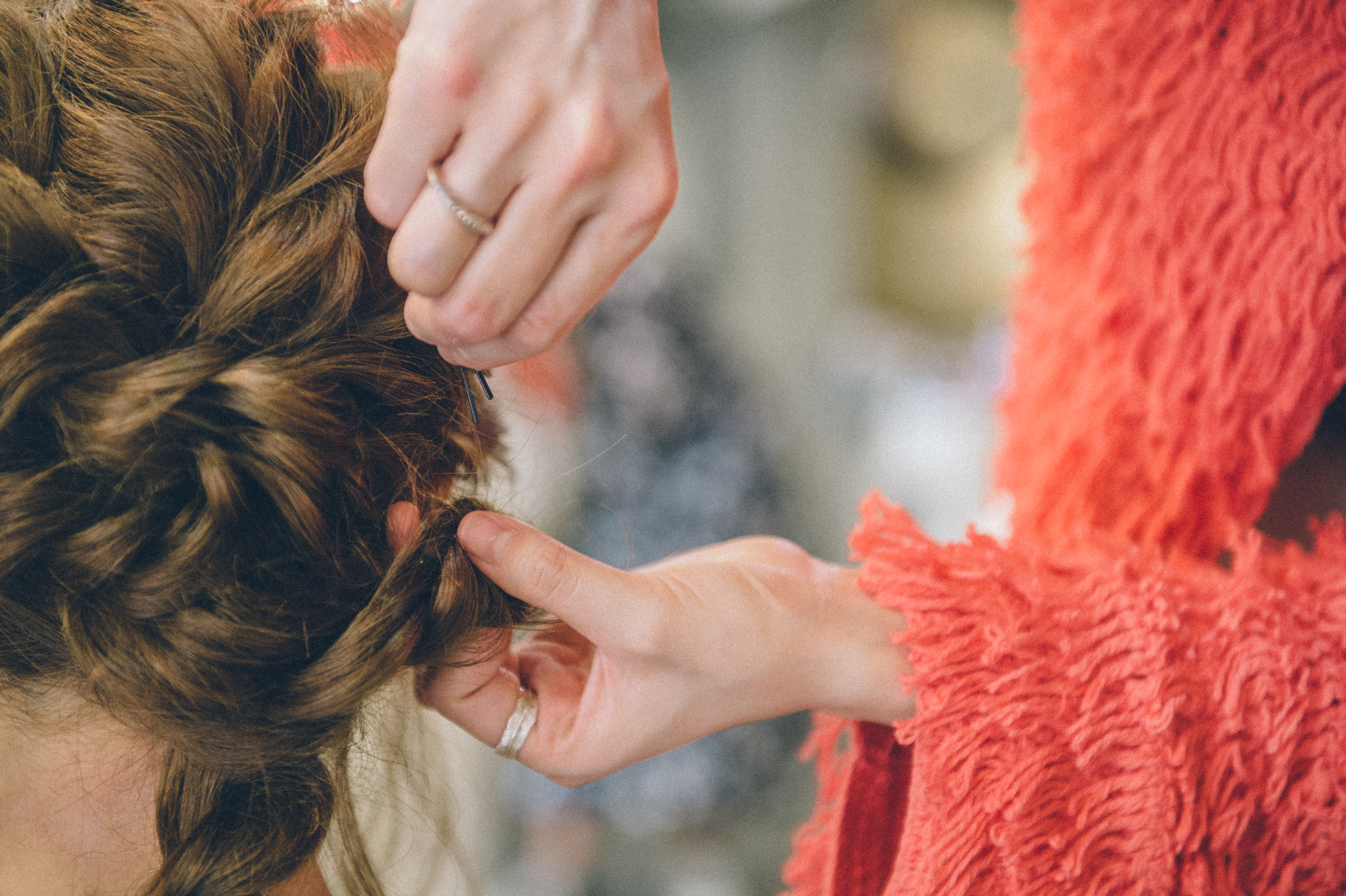 襟足もそれぞれの毛束をツイストし、ハチ上のゴムを隠すように交差してピンで固定する。