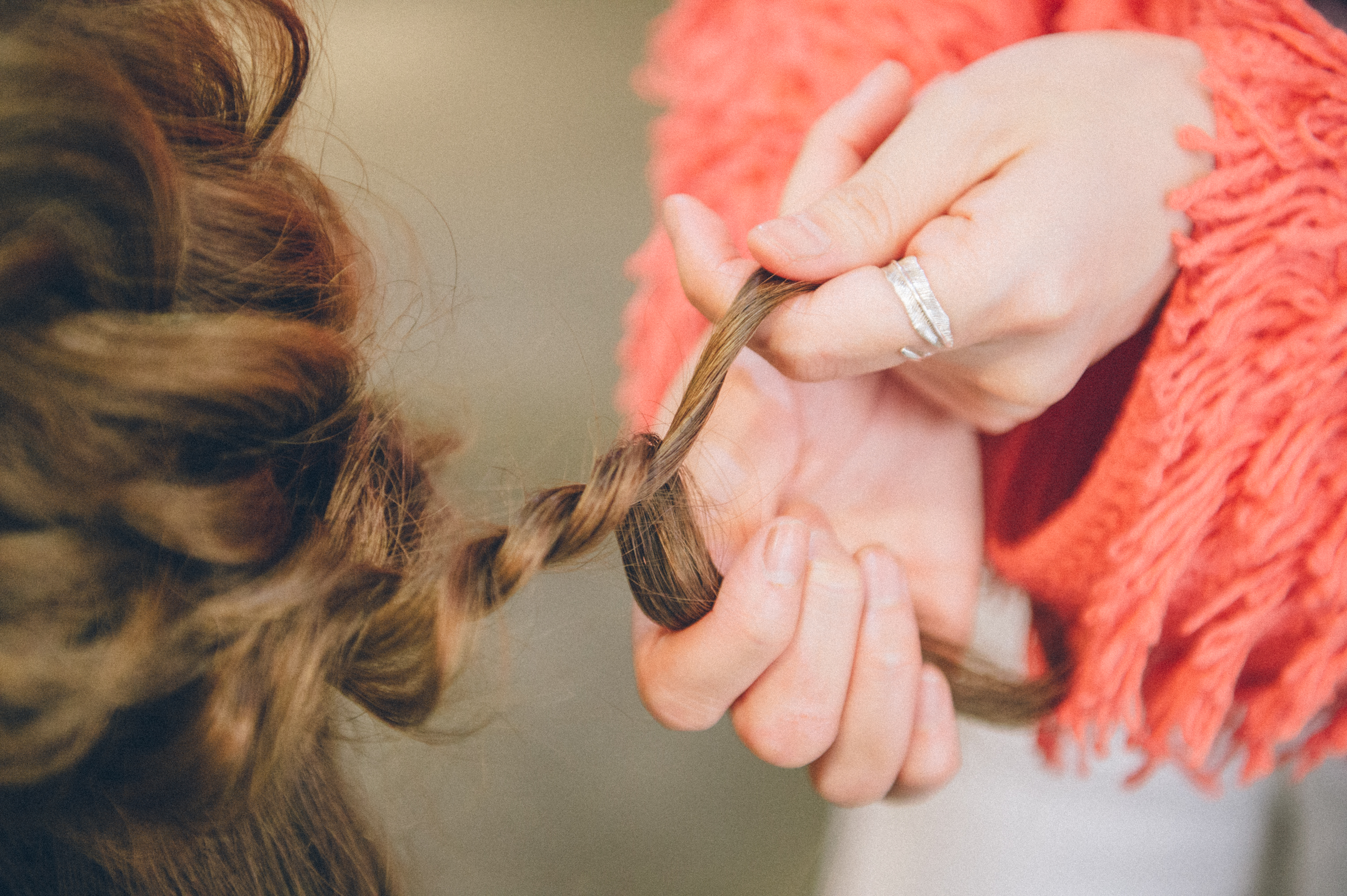 1本目のツイストの最後をゴムで結び、続くその他のツイストの毛先を同じゴムに入れ込む。