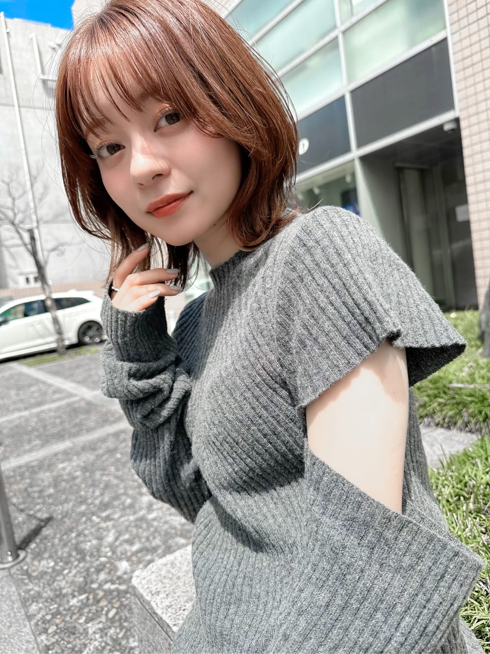 今回はブラウンベージュ。鎖骨レングスのボブをトレンド感あるくびれ風にアレンジして、大人っぽさとお洒落感を出しました。