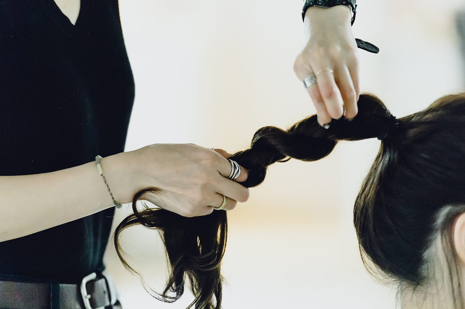 ポニーテールの毛束を2つに分け、ロープ編みにする。