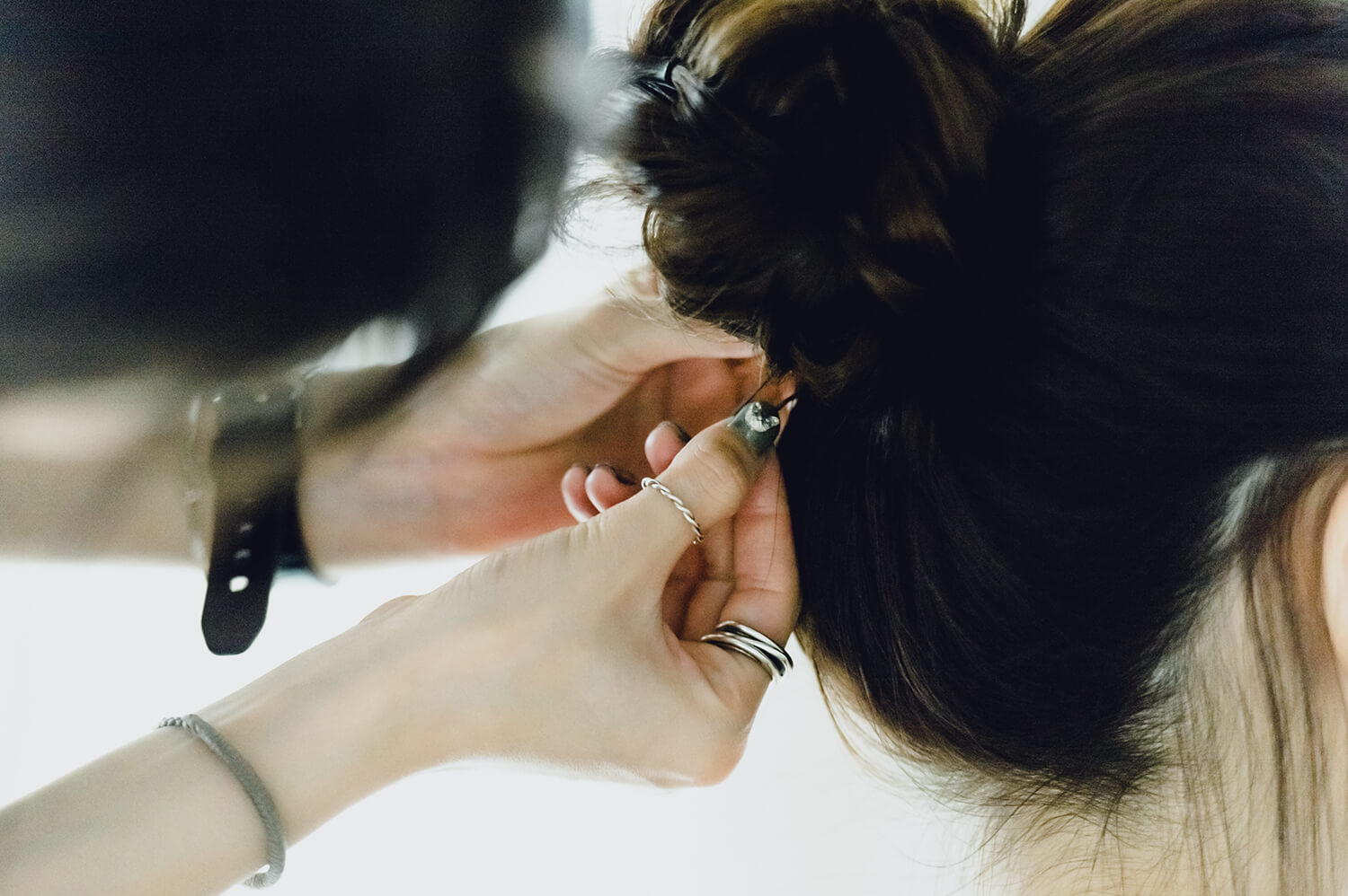 ロープ編みされた毛束を、ねじりながらゴムに巻きつけ、お団子の形を作る。