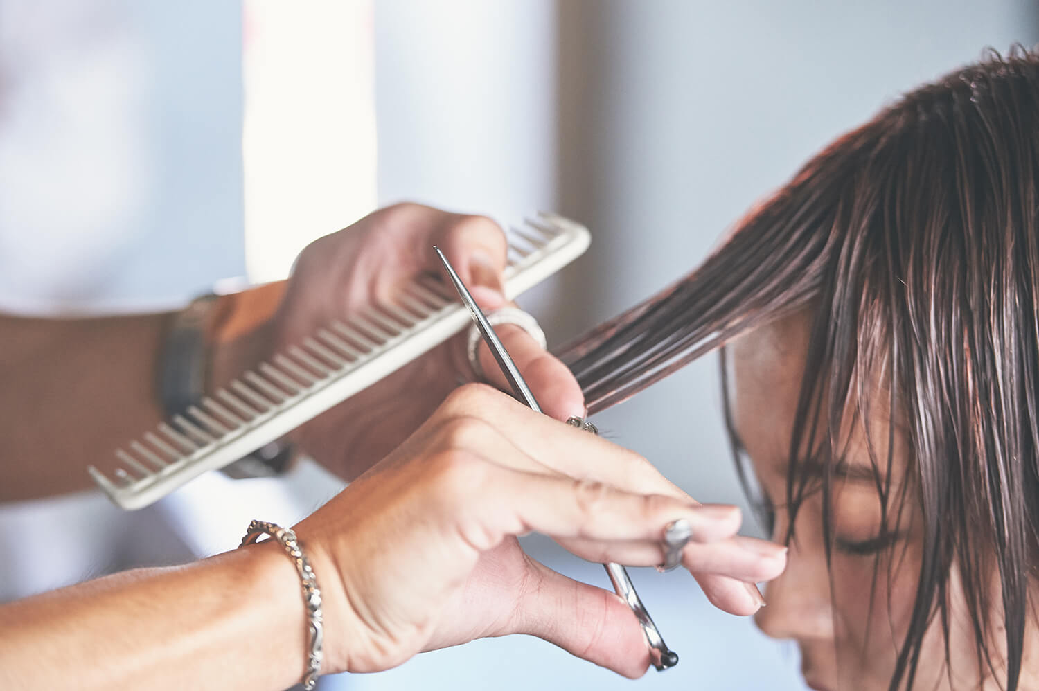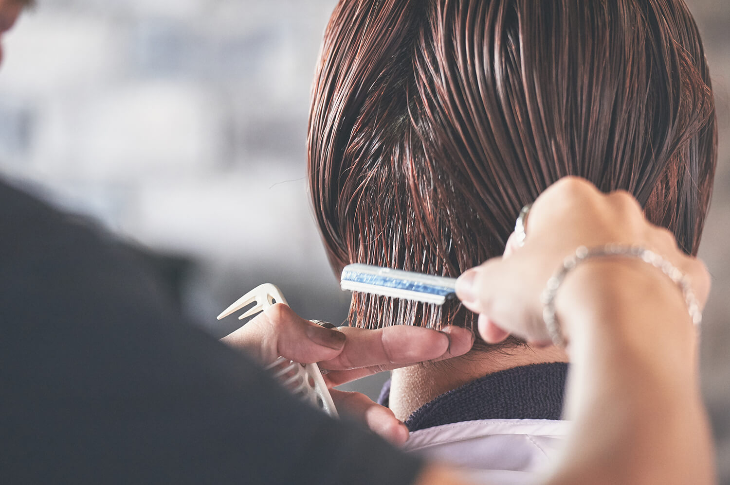 耳の後ろに毛量が溜まりハチ周りが広がりすぎないよう、セニングを使って調整する。