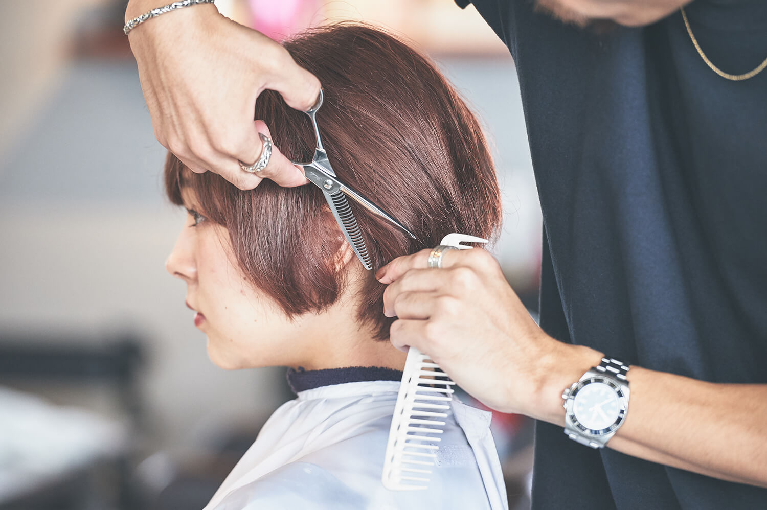 サイドから見て鼻と同じ高さを意識しながら、アンニュイ感のあるショートカットのシルエットを作る。